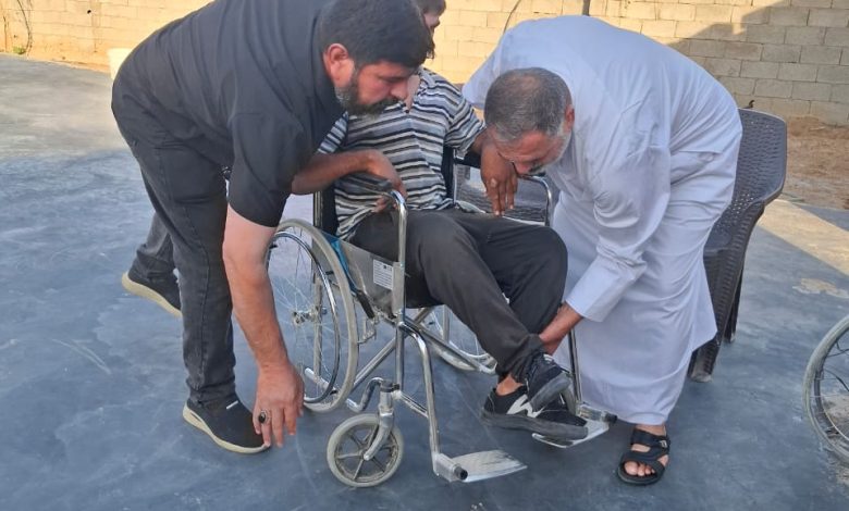 الحاج أبو أحمد العكيلي يقدم كرسياً متحركاً لمواطن من ذوي الاحتياجات الخاصة في قرية الجوهر ضمن مبادرات مركز الشهيد أبو مهدي المهندس الثقافي