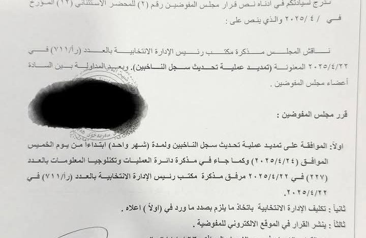 وجاء في وثيقة رسمية صادرة عن المجلس، أن قرار التمديد يهدف إلى إتاحة الفرصة أمام المواطنين الذين لم يتمكنوا من تحديث بياناتهم خلال الفترة السابقة، وذلك لضمان مشاركة أوسع في العملية الانتخابية المقبلة.